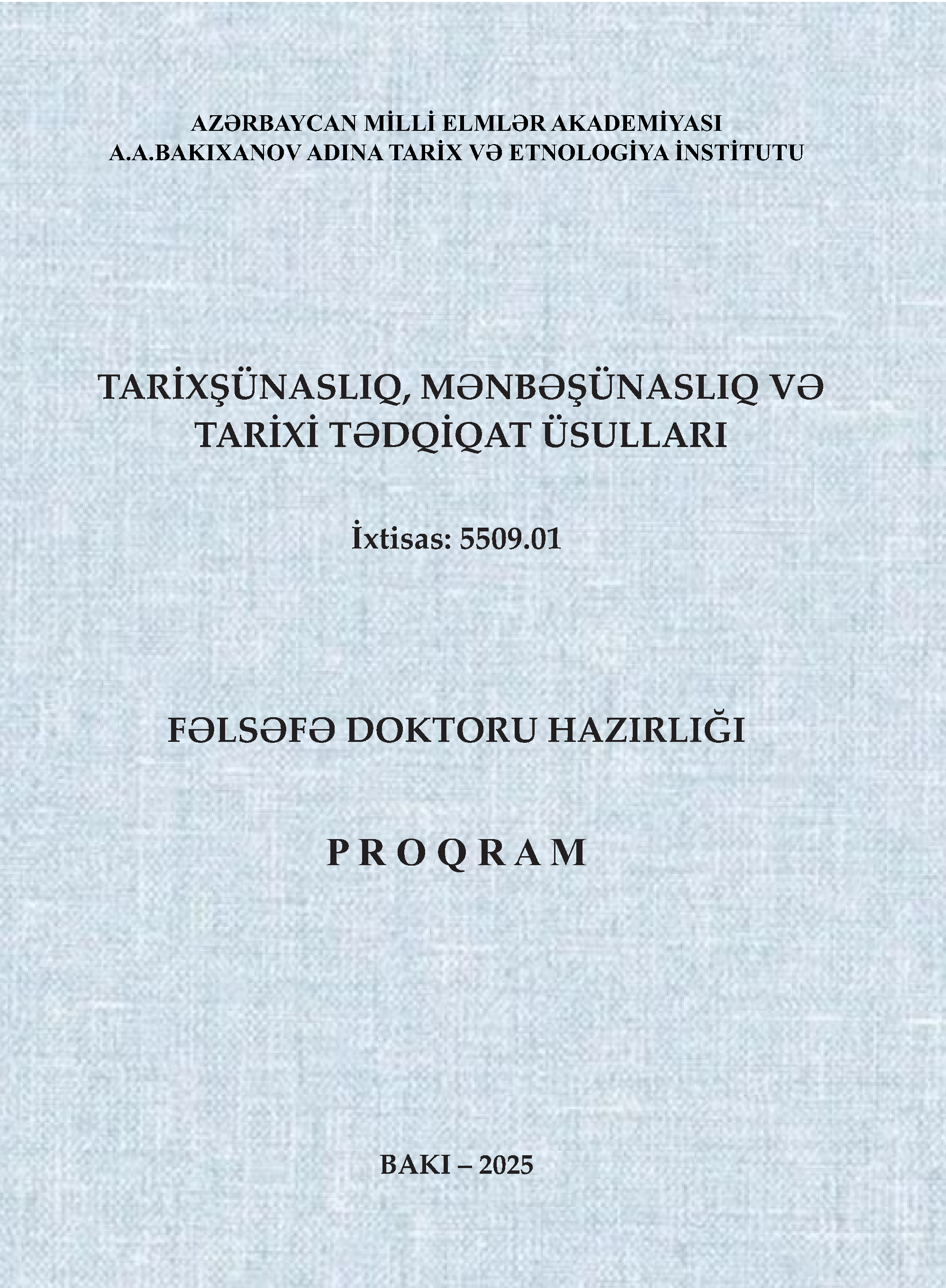 Mənbəşünaslıq, tarixşünaslıq və tarixi tədqiqat üsulları. İxtisas: 5509.01/ Fəlsəfə doktoru hazırlığı. Proqram. Bakı, “Nəşriyyat” şöbəsi, 2025, - 32 s.