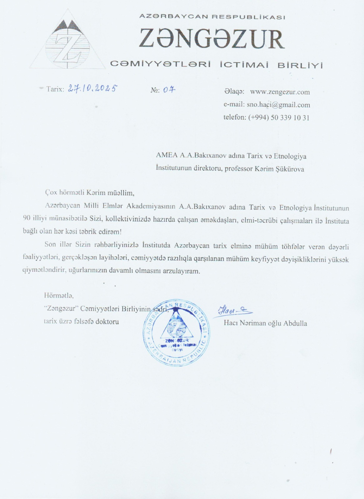 "Azərbaycan Respublikası Zəngəzur Cəmiyyətləri İctimai Birliyi" Tarix və Etnologiya İnstitutunu 90 illik yubileyi münasibətilə təbrik etmişdir Təbrik məktubu əlavə olunur.